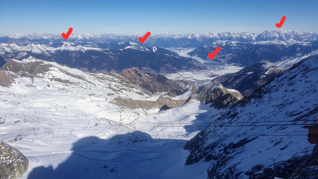 N-am făcut nici o poză în Schmitten așa că vă las asta de pe Kitzsteinhorn (cca 3000m) cu vedere spre nord. În mijlocul pozei se vede domeniul Schmitten și lacul pe jumătate înghețat din Zell am See. În stânga se văd pârtiile din Saalbach, iar în dreapta este muntele Hochkonig (cca 3000m).