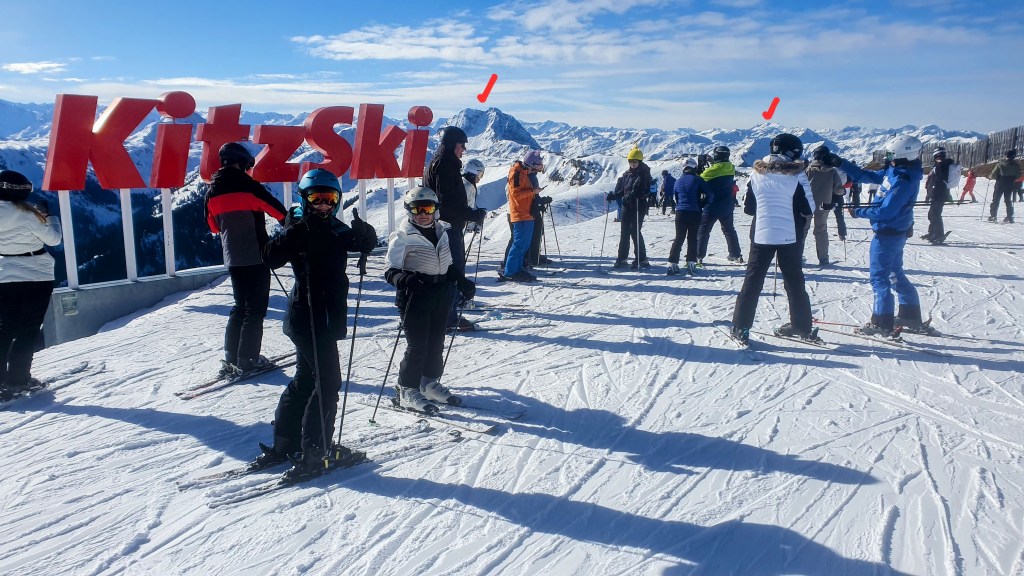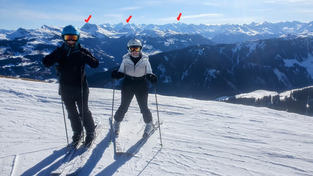 Fetele mele pe Steinbergkogel (cca 2000m) din domeniul Kitzbuhel, cu vedere spre sud-est. În spate se văd de la dreapta la stânga vârful Grossglockner (cca 3800m), Kitzsteinhorn-ul (cca 3000m) de la Kaprun e mascat în umbra munților din spate (Grosses Wiesbachhorn cca 3600m) și în stânga este vârful Geisstein (cca 2400m) de lângă Hinterglemm.