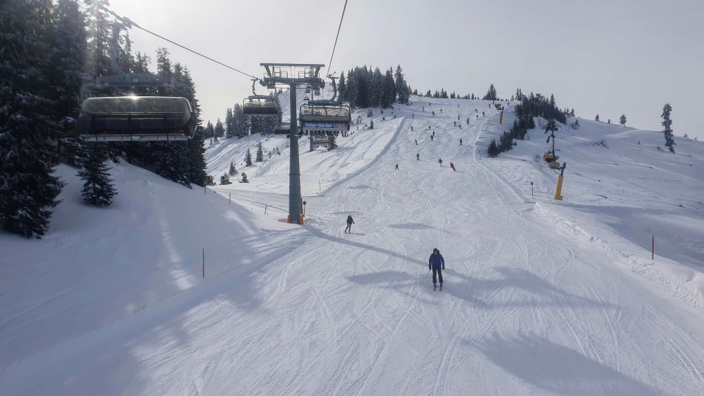 • Saalbach în schimb e regele. E la cca 30min de Kaprun sau Bruck și include vreo 270km de pârtii conectând stațiunile de pe valea Saalach (Vorderglemm, Saalbach, Hinterglemm) cu cele de peste munte (Leogang, Fieberbrunn). Apropos, celebrul Hochfilzen e și el acolo în trecătoarea dintre Leogang și Fieberbrunn dacă vreți să vă închinați la templul biatlonului mondial. N-are cum să nu-ți placă Saalbach! Am mers de două ori și nu m-am săturat. Dacă faci o tură din Leogang în Saalbach, Hinterglemm și înapoi, face cât o Sellaronda în Dolomiți. Trebuie neapărat să mergeți dacă sunteți în zonă. Pentru noi a fost capul listei de preferințe, chiar peste Kitzbuhel și Obertauern. Ah, dacă vă îmbie parcarea aia din clădirea gondolei Kohlmais, puteți prinde locuri în ea dimineața devreme, dar să nu uitați să vă validați biletul de parcare la caseria cu skipass-uri, altfel va costă niște jde euro parcarea. E ok și dacă parcați în Vorderglemm. După plaiurile din nord (nu ratați coborârile spre Leogang), vă puteți întoarce la parcare peste Schattberg, muntele din sudul văii. Teoretic puteți ajunge în domeniul Saalbach și din Schmitten, coborând pârtia Tannwald până în valea Saalach și apoi luând un skibus până în Vorderglemm. Nu merită. Mergeți cu mașina.