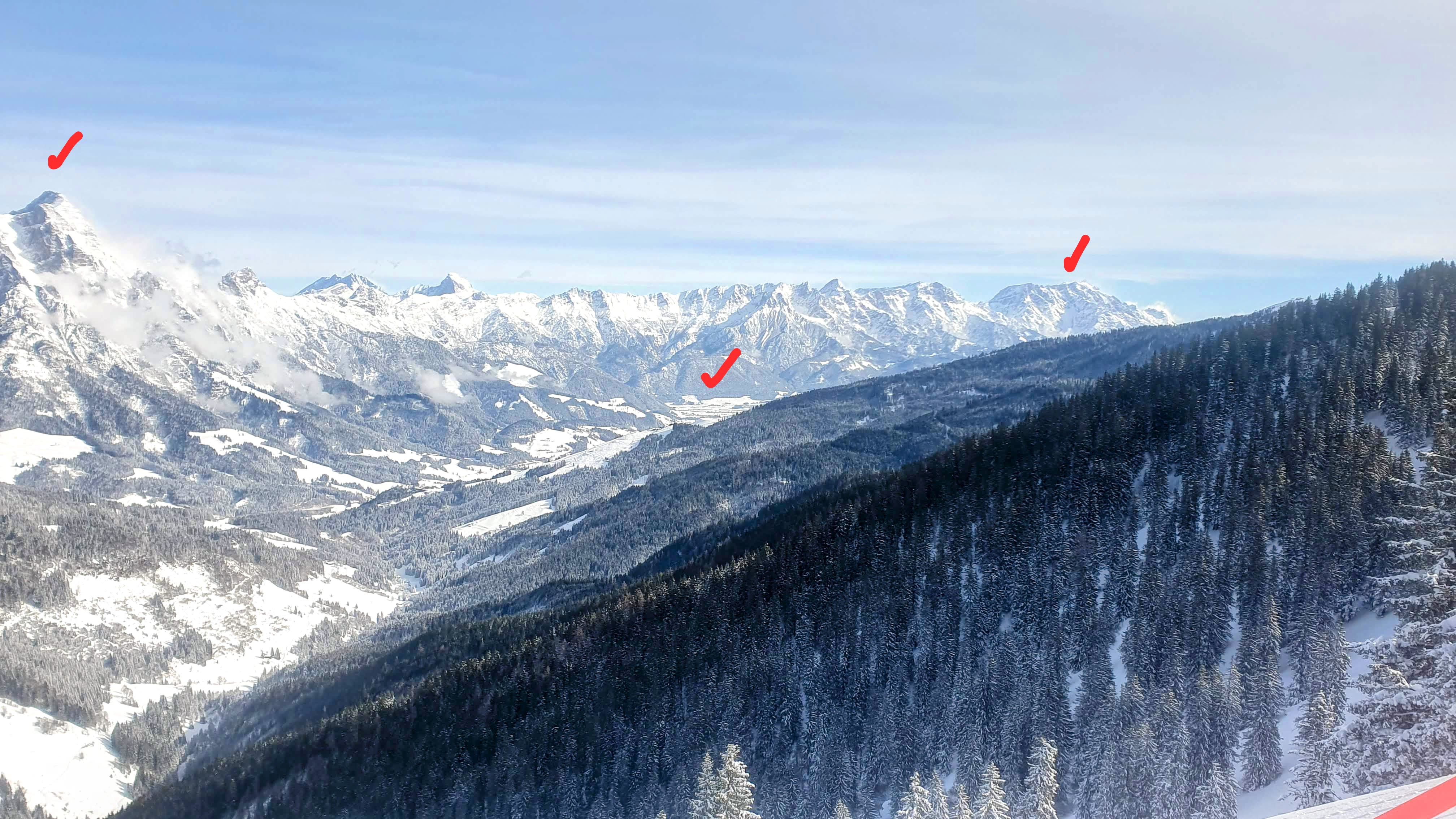 Fetele mele pe Steinbergkogel (cca 2000m) din domeniul Kitzbuhel, cu vedere spre sud-est. În spate se văd de la dreapta la stânga vârful Grossglockner (cca 3800m), Kitzsteinhorn-ul (cca 3000m) de la Kaprun e mascat în umbra munților din spate (Grosses Wiesbachhorn cca 3600m) și în stânga este vârful Geisstein (cca 2400m) de lângă Hinterglemm.