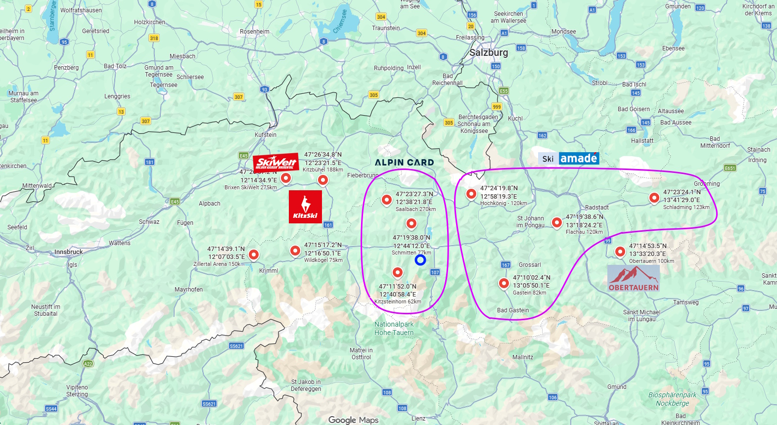 Sezonul ăsta însă ne-a gonit olimpiada, așa că ne-am întors în Austria. Știam deja Kaprunul din pandemie, dar atunci am stat mai mult în zonă. Cu experiența din Dolomiți și schimbat regiunile în fiecare zi, am planificat să facem același lucru și aici, să devină Austria „superski”. Am marcat 12 regiuni majore de schi în jurul Kaprunului, pe o rază de maxim 1h15min cu mașina și a ieșit asta: