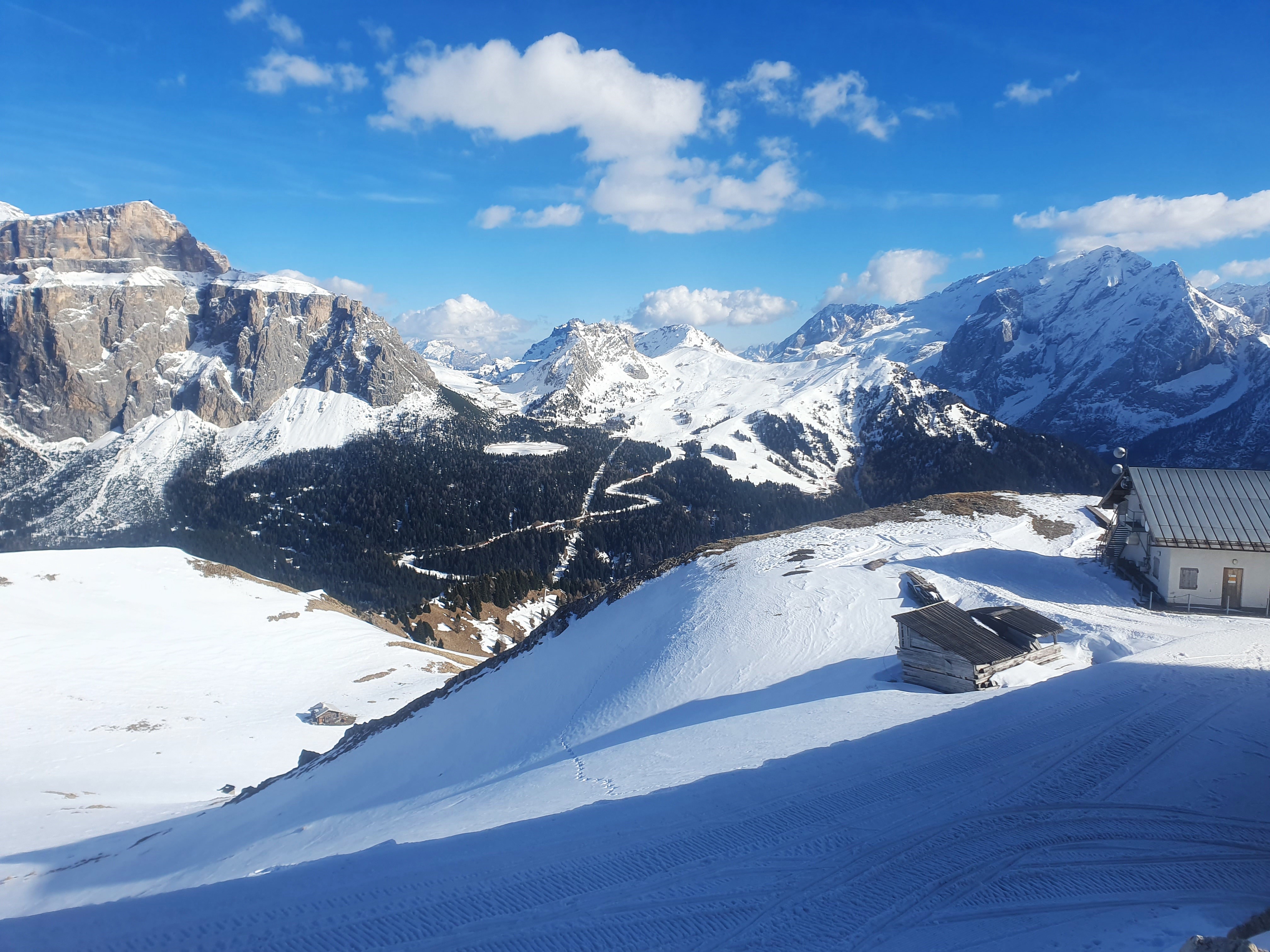 Al doilea pol major din Dolomiți este Cortina d’Ampezzo. Dacă e să alegeți cazare, e bine să vă decideți în jurul cărui pol vă veți duce, Sella sau Cortina, fiindcă oricât de ușor te poți deplasa între stațiuni, nu merită să mergi dintr-un capăt în altul doar pentru palmares. Ca să ajungi dintr-o regiune în alta, de cele mai multe ori trebuie să treci una sau mai multe trecători de 2000m, așa că nu vă mirați dacă vă estimează Waze 1h pentru distanțe mici de 40km. Noi am prins un februarie călduros și toate trecătorile au fost deschise mai tot timpul. Pregătiți-vă însă cu lanțuri fiindcă muntele e capricios și puteți prinde zăpadă zdravănă prin trecători până vin plugurile.