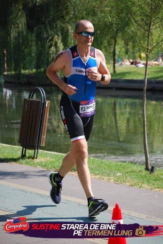 Bicicletă 20km. Bulevardele Rebreanu și Grigorescu au avut asfaltul impecabil și cursierele au zburdat pe ele. Eu am fost tot cu hibrida mea și n-am mai reușit să mă țin de nimeni, deși într-una din ture am decis să trag mai tare, dar atunci m-am trezit că duceam eu trena cuiva. N-am putut mai mult de o tură și nici să mă țin n-am putut după ei. Chiar și așa am reușit să întrec multă lume, terminând proba de bicicletă după 44 de minute cu o medie orară de 30km/h (erau de fapt vreo 22km reali), cu al 59-lea timp dintre finisheri. Fiindcă traseul era de vreo 2,5km, el trebuia parcurs de 8 ori. Ei bine, au fost vreo 5 concurenți care nu au numărat bine și au fost descalificați. Și eu m-am panicat un pic, fiindcă mă bazam pe GPS dar am apăsat aiurea pe butoane în tranziție și ceasul era în bălării. Mi-a fost teamă că va trebui să număr și eu turele, dar am reușit să repornesc GPS-ul după cca un km și să-mi intru în ritm. 3 minute a durat tranziția spre alergare. Schimbatul încălțărilor nu este o specialitate pentru mine.