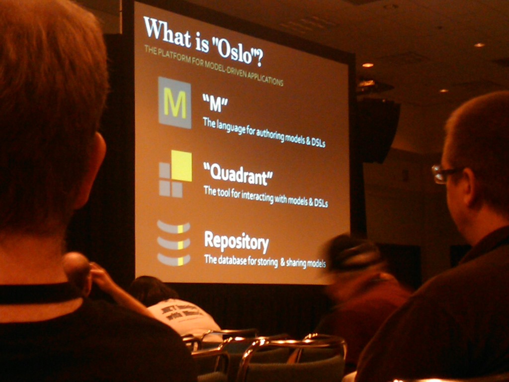 - Oslo e platforma de aplicații model-driven de la Microsoft. Avem un prim CTP și tocmai am anunțat că vom publica limbajul M sub Open Specification Promise. Cu Oslo, vom putea crea DSL-uri (Domain Specific Languages) pentru a automatiza părți din procesul de dezvoltare. M este și el un DSL. Dacă imaginăm 3 nivele de implicare a modelelor în ciclul de viață al aplicațiilor, Oslo este la cel mai înalt nivel: