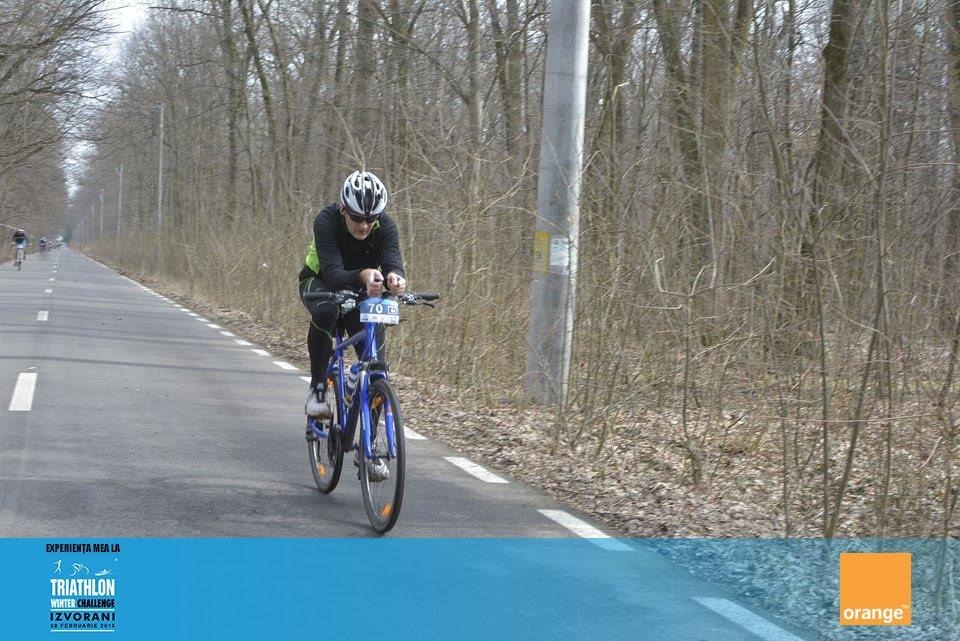 Bicicletă 15km. Trei bucle de cca 4,3km trebuiau făcute pe un traseu complet acoperit de zăpadă. Doar drumul până la și de la bucle era asfalt uscat de cca 1km. Știam că nu va fi la fel de nasol ca la Cheile Grădiștei Fundata, unde am suferit cumplit pe traseul acela cu zăpadă adâncă. Aici era zăpada bătătorită cam jumătate din buclă, cam un sfert era zăpadă fleșcăită dar subțire, iar pe latura nordică a buclei cca (800m) ne-au băgat prin pădure, unde mai toată lumea a mers pe lângă bicicletă. Doar ultimii 200 din latura asta reușeam să merg pe bicicletă. Pe ultima buclă când împingeam bicicleta prin pădure, am început să simt un cârcel la gambe și atunci mi-am dat seama că la înot va fi dezastru.
